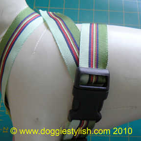 Deshacer el cierre y coloque el lazo sobre la cabeza de su perro. Tomar los extremos sueltos del snap y vuélvalos a conectar. Este es el momento de ajustar el arnés según sea necesario. Deje un poco "play" en el extremo del slider del arnés para que se puede ajustar cuando el arnés se ha acabado. Tire de la cinta contra su perro.