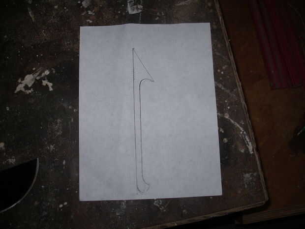 Papel milimetrado ayuda aquí, bosquejar hacia fuera lo que quiere la herramienta para que parezca, es útil incluir una línea que indica dónde se detendrá el bisel de la hoja (me olvidé de hacer eso). Fot esta hice la hoja en un ángulo de 30 grados a la empuñadura, si hacía otro reduciría que a 20 o 25 grados. Es 8 pulgadas sobre todo, la hoja está 2 1/2 pulgadas de largo, la parte principal del mango es aproximadamente 1/2 una pulgada de espesor. La curva en la base de la hoja sirve un doble propósito de agarre para la mano y hacer una púa, asegurando cualquier palillo no viene perder. Alinee el borde plano de la blanco y la plantilla y pegar la plantilla sobre el metal. Cualquier pegamento funcionará pero utilicé pegamento para no tener que esperar tiempo para que se seque.