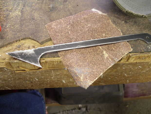 Próximo arena el papel, arena alrededor de los bordes, la arena la arena lisa, de bordes el archivo marca la hoja. Empiece con papel de grano 60 y hasta por lo menos 220. El más cuidado y más granos vas a mejor se verá al final. Usted realmente no necesita preocuparse de lijado de la capa negra si estás usando un machete de walmart; lo ayudaremos a evitar que se oxiden por salir como mucho en como sea posible pero si te cuidas de lo no tiene.
