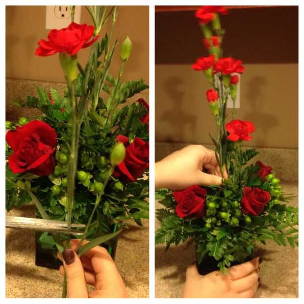 Tendrá un tallo más de mini claveles. Este tallo debe cortarse sólo ligeramente más corto que el primer vástago de mini claveles. Después de cortar, insertar estos mini claveles frente a la primera potencia.