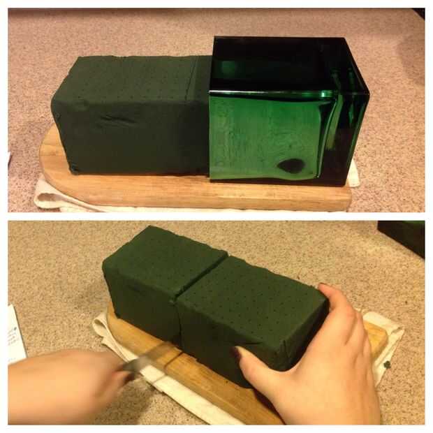 Tomar la toalla pequeña y doblar por la mitad; Coloque la tabla de cortar encima de la toalla doblada. Introducir la espuma en el cubo. Luego tomar el cuchillo y hacer una línea de luz sobre el borde del cubo. Esta línea le dirá dónde cortar la espuma. Después de esto, quite el bloque de espuma del cubo y cortar la línea.