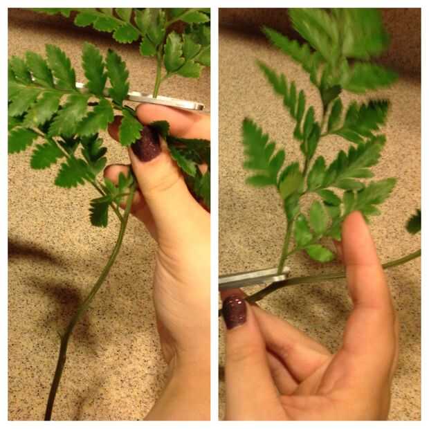 Sacar cuatro o cinco tallos de tiene. Corte los dos conjuntos más grandes de las hojas en la parte inferior y el agrupamiento pequeño de hojas en la parte superior. Usted puede lanzar lejos la sección media y el tallo, si lo desea. Las piezas no se utilizará en el presente acuerdo.