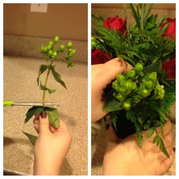 Con cuatro tallos, corte las bayas hypernicum cerca de la misma longitud que las rosas. Un vástago de las bayas entre cada rosa del palillo.