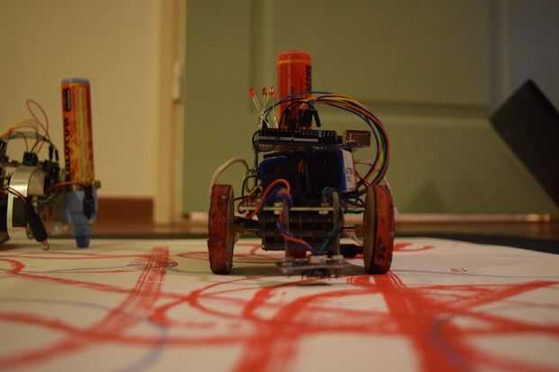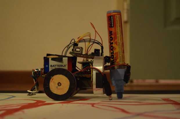 Para el curso de Hardware y computación física bajo la supervisión de Paul Klomp como parte de la tecnología de los medios de comunicación programa de la Universidad de Leiden, creamos dos robots dibujos. Cada robot fue construido alrededor de un Arduino Uno y dotado de dos ruedas impulsadas por motores de DC, un marcador de pintura acrílica y un sensor de color. Dejar un rastro de color en el papel blanco que estaban manejando en y cambiar su comportamiento dependiendo de los colores que detectaría su sensor de color. El resultado, una obra de arte evolutivo creado por robots haciendo movimientos basados en reglas sencillas.
