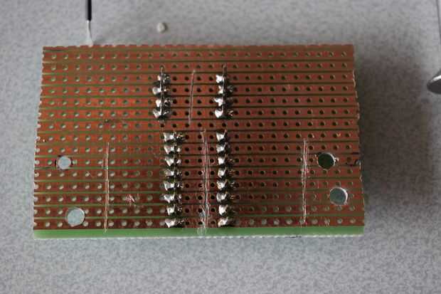 A continuación, las fichas están soldadas a un menor printboard. En nuestro caso, tuvimos que cortar a través de los carriles de cobre para prevenir cortocircuitos de suceso, entre los polos, así como alrededor de los agujeros para los pernos.