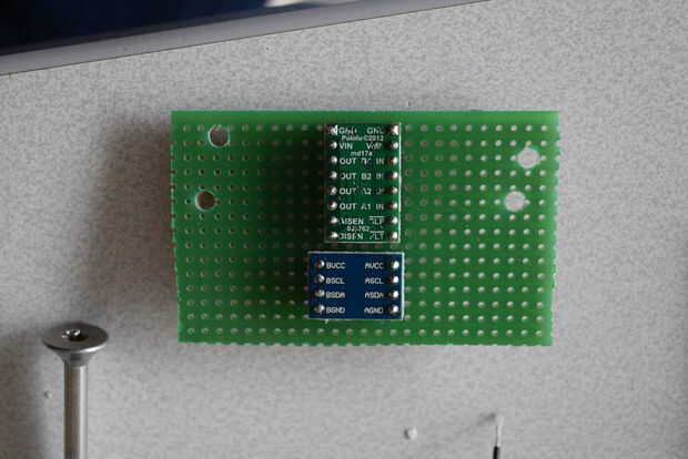 Las filas de pines son soldadas a la DRV8833 y chips I2C.