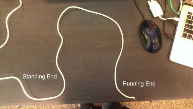 Tomar cerca de 2 pies de cuerda. ADVERTENCIA: AL SELECCIONAR UN CABLE, ASEGÚRESE DE QUE UTILIZAR A UNO BASTANTE FUERTE PARA SU USO. Que usando tendedero para la demostración, pero obviamente yo no usaría esto en un intento de rescate. Designar a un extremo como el "fin de pie" y el otro como el "fin de la marcha". Mis designaciones pueden verse en la imagen.