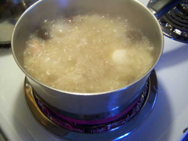 Fideos de la cocinan bastante rápidamente, ni un minuto de ebullición adecuada. Así que si usted no quiere un huevo, simplemente espere hasta que los fideos son blando y 'glassey', alrededor de un minuto.