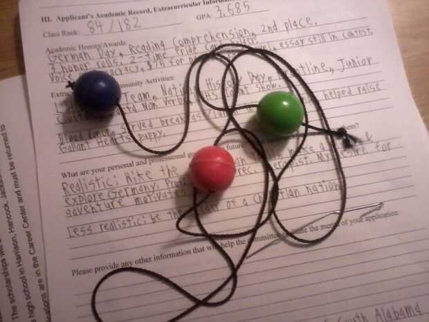 Esto es algo que solía tener como un niño (mis padres compraron en algún lugar), pero nunca fui capaz de encontrarlo. Simplemente desapareció de mi vida. Así que decidí hacer mi propio!!!! Tuve algunas pelotas saltarinas ahí, y le pregunté a mis padres si me llevaría a Walmart a alguna cadena. Perforado, roscado, atado y voila - un nuevo juguete! Usted puede hacer todo tipo de trucos con ellos y te juro que parece que la física en acción.