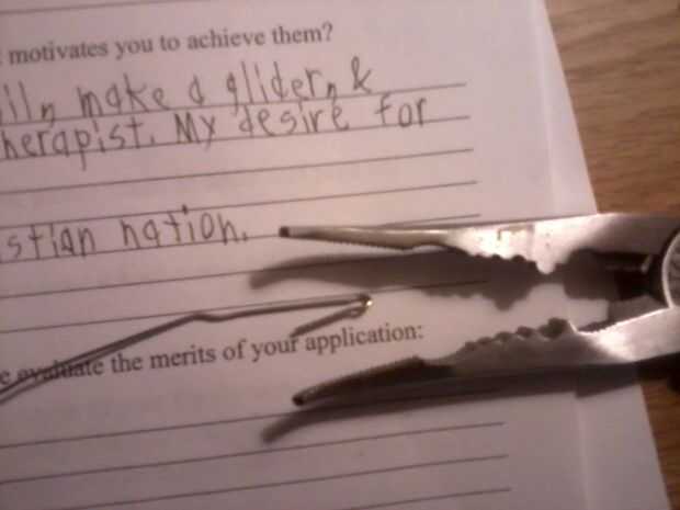 Así que tome ese extremo de cadena y lazo en el extremo doblado de la clip. Luego tomar los alicates y ensuciarse la parte plana (como se muestra). Ahora tienes una "aguja".
