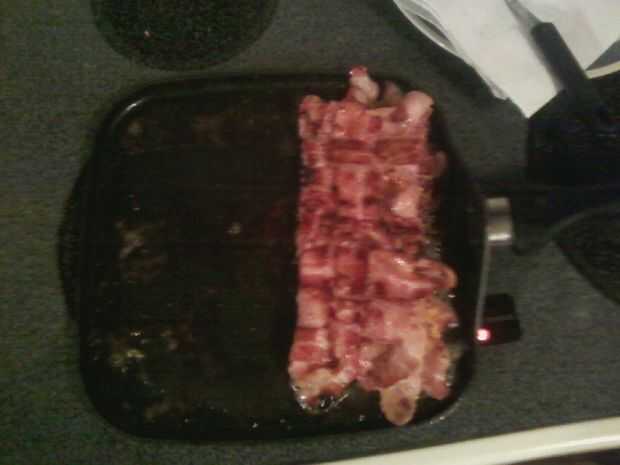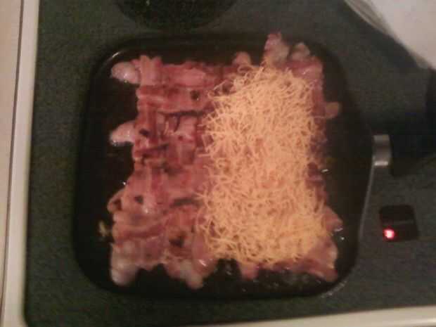 muy simple, añadir sobre media libra de queso a un lado de la estera de tocino. Además, la temperatura aumentará un poco. Como el queso comienza a derretirse, voltee el lado vacío de la lámina perimétrica en el queso.