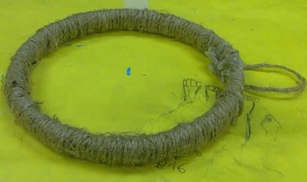 Utilice la cadena gruesa para envolver alrededor del anillo en espirales apretadas. Estoy utilizando yute Natural porque me gusta el aspecto pero puede usarlo que quieras. Para iniciarlo, haga un nudo en la parte superior y luego. Después de todo está envuelto, ate otro nudo si no tienes pegamento. Si lo haces, unir el nudo original y el último de la cadena. Asegúrese de que hay 2-3 pulgadas para hacer un lazo.