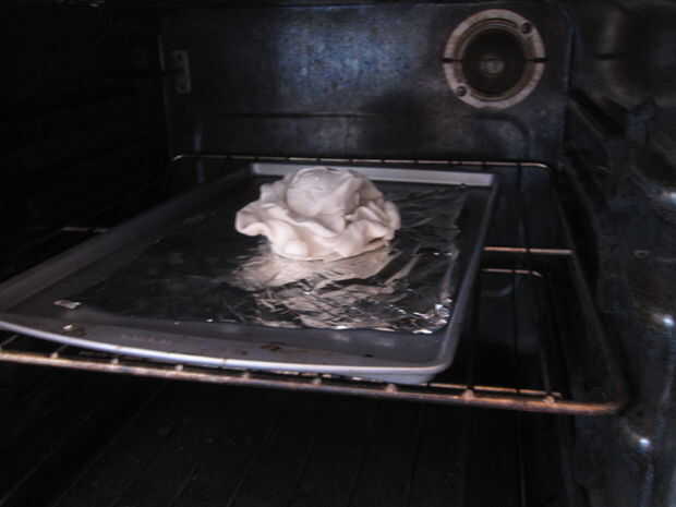 Mientras que la escultura está horneando, prepárese la lata relleno de papel de aluminio en él. Esto apoyará la escultura.