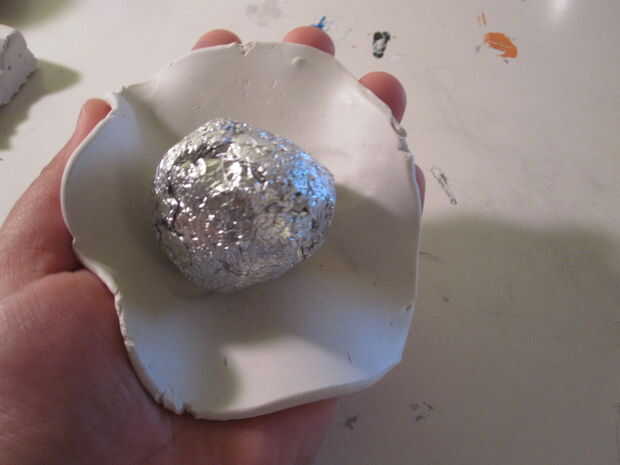 Cubrir cuidadosamente la bola de papel aluminio con la arcilla aplanada. Asegúrese de que la superficie es lisa. Crear una base en la parte inferior para que la bola puede valerse por sí mismo.