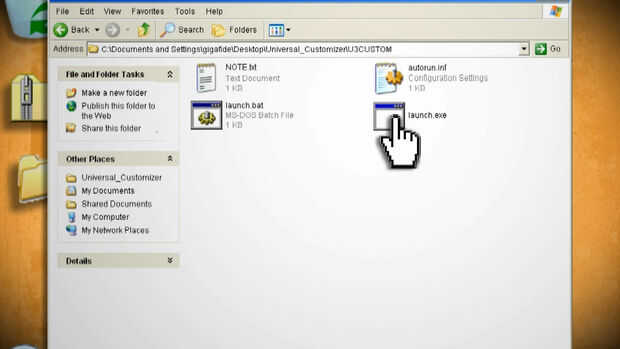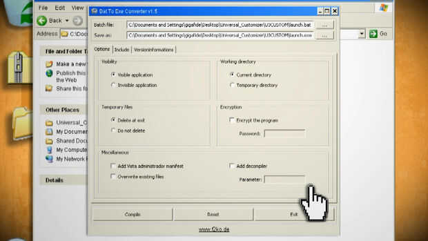 Para convertir launch.bat en un ejecutable, ir a th y descargar el Bat to EXE converter. Lo abren y ejecutan el archivo exe. Para el campo "Archivo por lotes", punto en el archivo "launch.bat" que creaste. Haga clic en "compilar". Ahora debería ver un archivo "launch.exe" en la carpeta "U3Custom".