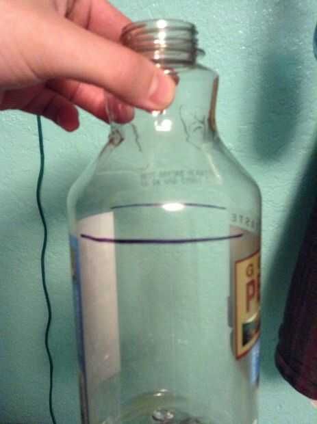 Si todavía no has terminado de beber el líquido en la segunda botella, ahora sería un buen momento para hacerlo. El segundo envase y en vez de marca alrededor de la base, una línea recta todo el camino alrededor de la botella justo por debajo del cuello. Esta parte del contenedor será la sección inferior de la jardinera y mantendrá una reserva de agua para su planta
