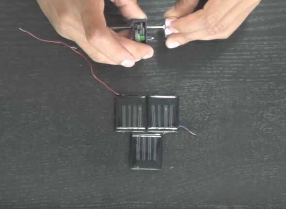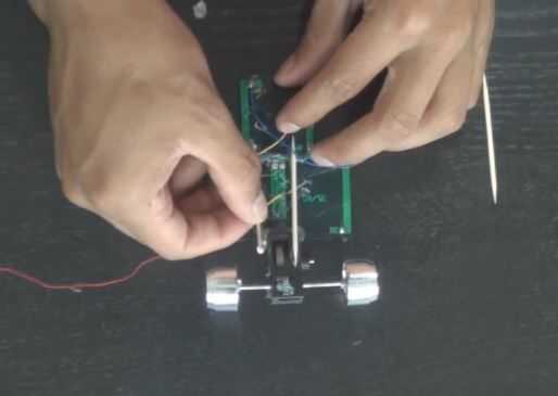 Una vez que la caja de engranajes se obtiene pegamento sobre paneles solares tho. Para añadir estructura se puede ver en la parte inferior que os adjunto 2 palillos con pegamento. Esto mejora la estructura de la conexión del panel solar y caja de cambios y le permite llevar una carga más con eficacia. Luego tomar 2 ruedas del kit del tuneup y coloque en el eje de la caja de cambios. Poco de pegamento puede ser necesaria.