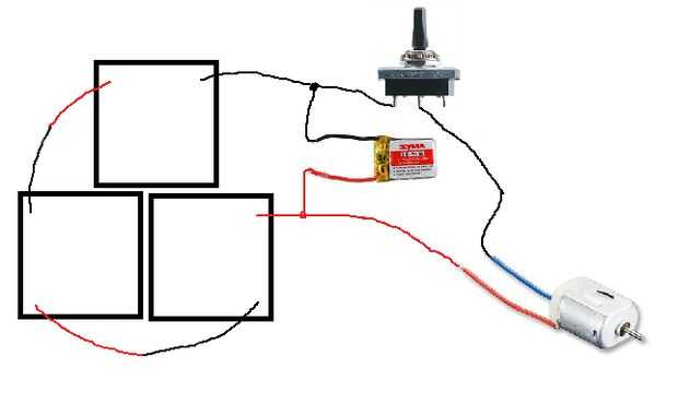 A continuación se adjunta un interruptor. Un lado del interruptor está conectado al negativo del panel solar y batería. Al otro lado del interruptor va al negativo del motor. El lado positivo del motor está conectado al positivo del motor y batería. Una imagen completa puede observarse por encima de lo que debería ser el circuito final.