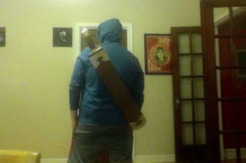 -sugiero pintura esta porción antes de pegar en el lugar.6. Tome su correa y fíjelo a la espada con clips divididos. Corté la cinta por la mitad para que sea ajustable.