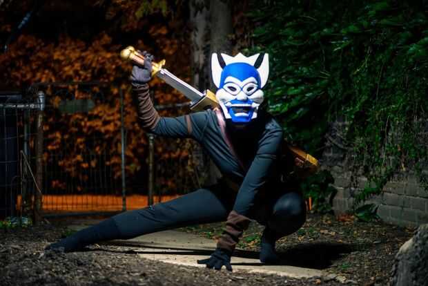 -Compra incluye máscara, espada + funda, muñeca envolturas, envolturas de shin, envolver la cintura y correas. No incluye pantalón negro, camisa negra, pasamontañas negros o zapatos.