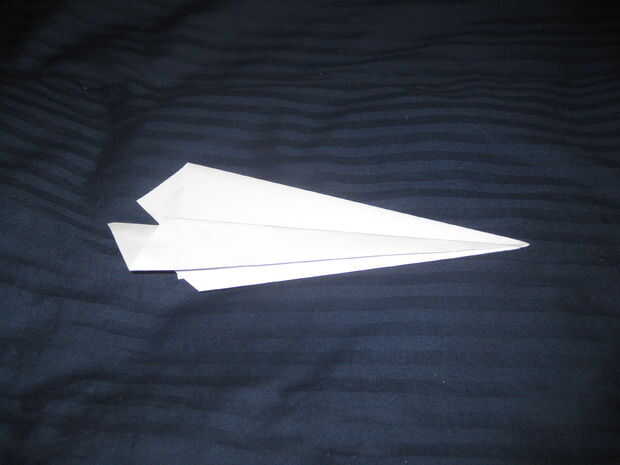Esta parte podría requerir cierta rotación del plano para obtener un buen ángulo de - soy un zurdo, por lo que estoy genéticamente programado para hacer las cosas difíciles para todo el mundo (solo pregunte a mi mamá). Básicamente, usted tiene un pliegue grueso, grasa en el centro ahora - esto será la base de su avión. Tomar el extremo suelto del doblez y dóblelo hacia abajo a lo largo de este pliegue para crear el ala.
