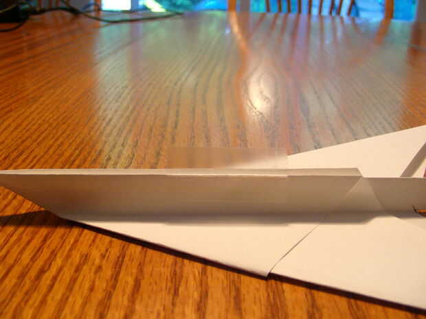 Mientras que probablemente podía volar el avión ahora, funciona mejor cuando usted la cinta en unos pocos lugares. Lugar 1: (Pics.1 & 2) cinta bajo el cuerpo principal del avión. (habrá tres aletas. cinta sólo sobre los dos exteriores) (también es un poco flojo, asegúrese de tenerlo apretado)