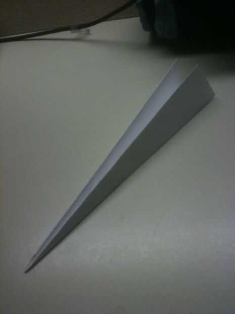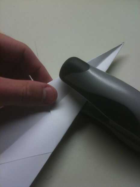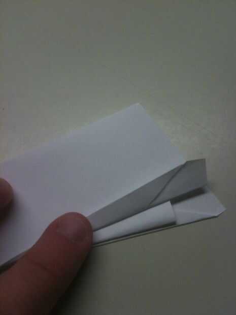 3. doble el borde de cada ala en la parte posterior del plano más de la mitad de un centímetro para crear los estabilizadores. Cada estabilizador se debe ejecutar aproximadamente 2 pulgadas a lo largo del borde del ala de la parte posterior del avión.