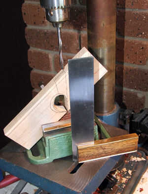Para empezar la ranura de la cuchilla y cuña, Monte el cuerpo en una prensa de taladro y alinee la línea de la rana en el lado con una broca de ½" o 6,5 mm, preferiblemente un forstner o brad punto poco. Coloque una escuadra sobre la mesa del taladro para comprobar.