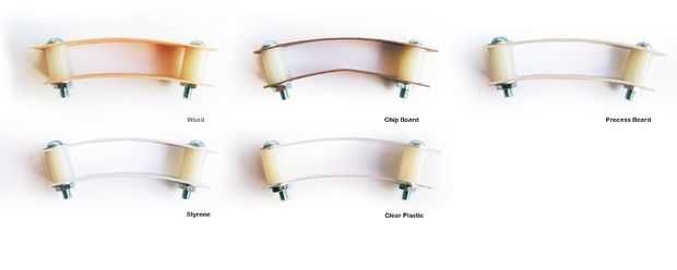Utilizamos material múltiples para hacer la prueba de módulo. La madera es fácil doblar a lo largo del grano, pero también es fácil de romperse en la otra dirección debido a la orientación natural del material. Tablero de viruta no es lo suficientemente fuerte para doblar y se de la hebilla en el centro del módulo. Proceso tablero funciona bien en esta prueba pero será también de la hebilla en el centro si curva demasiado. Estireno y claro plástico parece ser el material adecuado para este módulo porque material artificial no tiene orientación específica y es más flexible que otros materiales.
