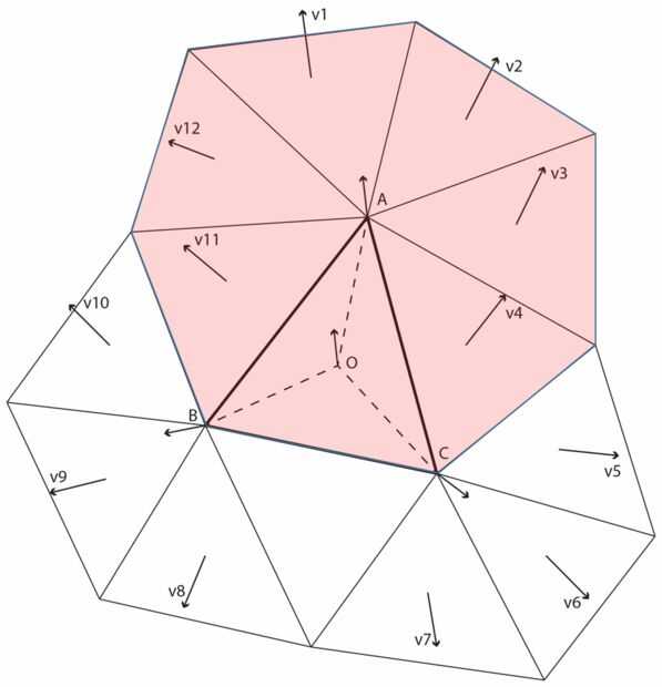 Para poder utilizar el módulo que hemos diseñado para doblar para que coincida con la forma de la malla, tenemos que calcular la dirección del vector de cada vértice. El vector del centroide es igual al vector normal del triángulo, que puede ser calculado por el producto cruzado. Y el vector de cada vértice es igual al vector general de todos los triángulos vecinos. Como un vector es igual a la media de todos los vectores normales en la zona roja.