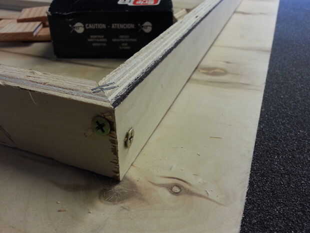 Tomar su larga, delgada 1.5" tablero y cortarlas en aproximadamente 18" secciones con 45 grados de ángulos de inglete. Luego montarlos como esquina. Necesitarás 5 soportes total. Puede que necesite coinciden la longitud de uno o más de los soportes más adelante para caber su proyecto final. Engrapadas las esquinas exteriores entonces condujo los tornillos en los extremos para hacer los soportes. (Era demasiado perezoso para pegar las esquinas, pero que sería una buena idea. Si te gusta la carpintería, hacer un mejor trabajo que este). No conecte a nada todavía. Viene a continuación.