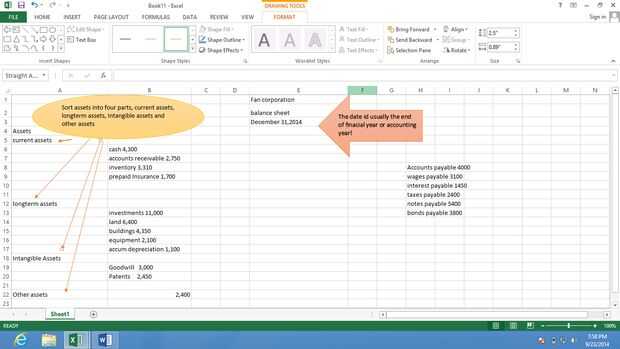 En primer lugar, escriba el título de su balance. La primera línea es el nombre de la empresa, es de segunda línea "balance general" y tercera línea es el final del período de contabilidad de la empresa (como demostraciones del cuadro B). Después de eso, usted necesita encontrar activos y agregar en cuatro categorías en el lado izquierdo: activo corriente, activo a largo plazo, activos intangibles y otros activos (Figura B). Por último, calcular la cantidad total de cada parte y además de ellos juntos para obtener el número total de activos.