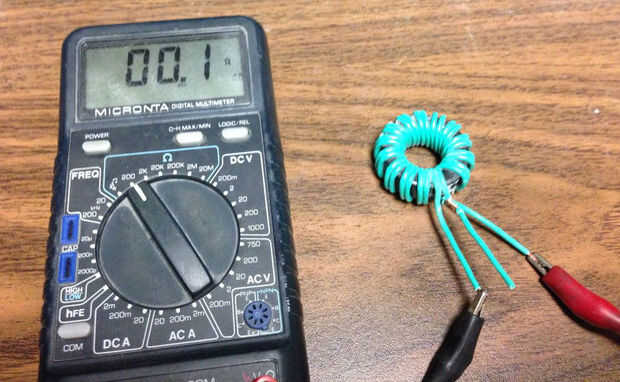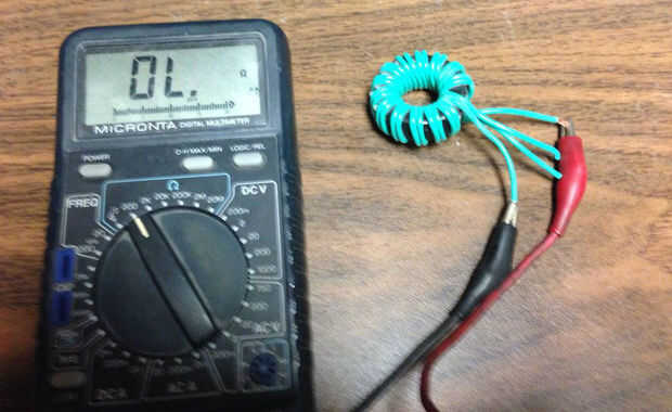 Después se hace la bobina la bobina capa lo con pegamento o goma laca para mantener juntos. Ahora tira todas las 4 pistas y conecte el medidor al inicio y un final. Si tienes continuidad cambiar al otro cable del final. Ahora que tiene dos conductores sin continuidad estas marcan como lleva la antena. Éstos se van a los bornes. Ahora conectan los 2 cables restantes. Esta es la llave del centro de la bobina. Esto completará el circuito y el metro mostrará continuidad. Este grifo de centro será el punto de alimentación. Cómo se conecta decide si es un Balun o Unun