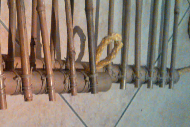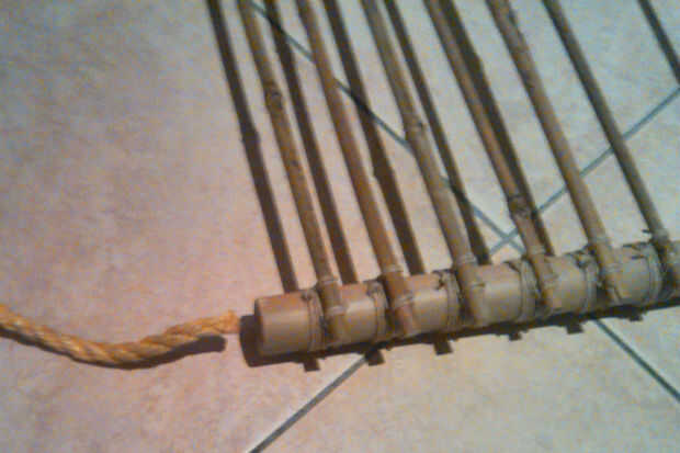 Extracto de la cuerda a través del agujero en el centro del palo de bambú