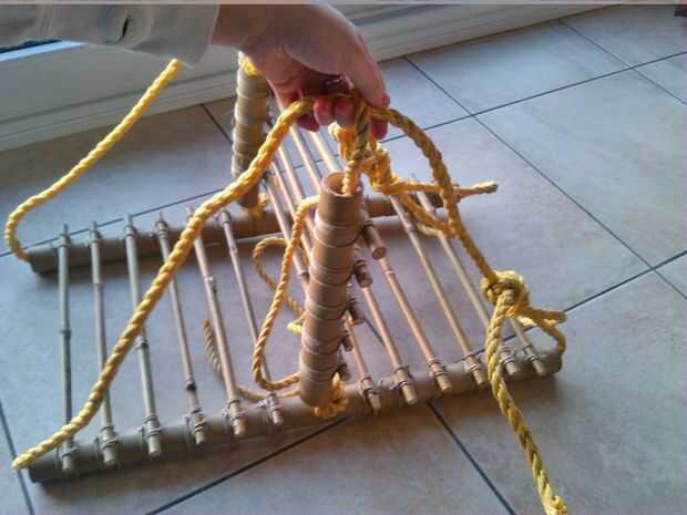 Formar un triángulo con los 2 extremos de la cuerda a través del palillo de bambú de 65cm como se muestra y les nudo muy bien con un nudo cuadrado
