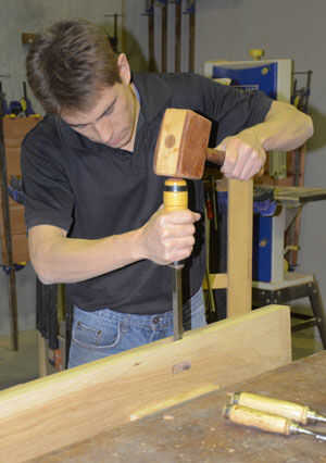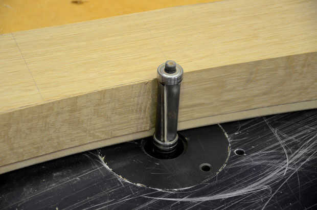 Un router bit con guía cojinetes superior e inferior le permite voltear la pierna por lo que no se está distribuyendo nunca a contrapelo. Una vez que las patas traseras son formadas para que coincida con su plantilla puede entonces marcar y cortar mortajas para los apoyabrazos y los rieles superior e inferior del respaldo. Su dibujo de tamaño completo ayudará a asegurar el apoyabrazos se une a la pierna trasera a la altura dictada por su unión en la pata delantera. Las patas delanteras en mi banco son rectas por lo que simplemente les arrancaron desde el espacio en blanco en el Hanon.