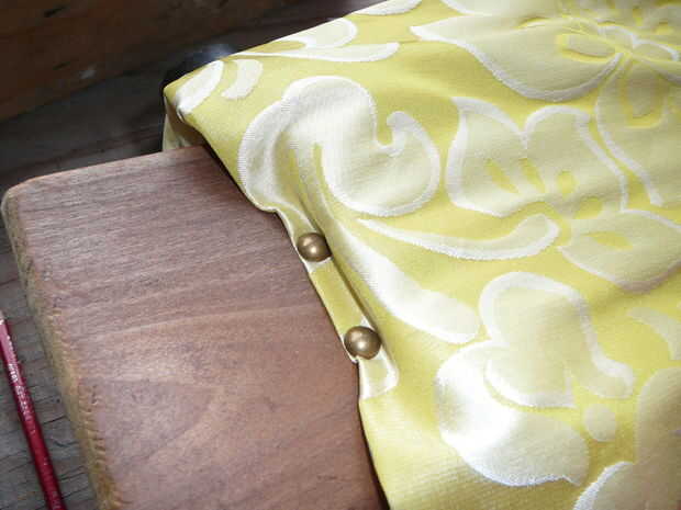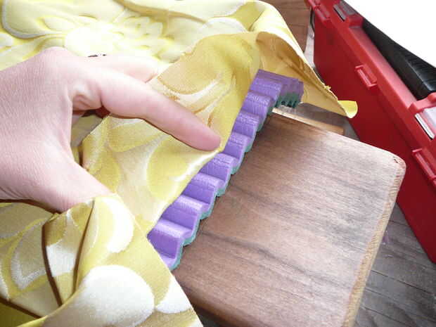 A continuación, doble más un lado de la tela y colóquelo centrado, cerca de 5 milímetros sobre la marca hecha a un lado de la almohadilla. Fijar la tela a la banca con dos tachuelas de tapicería (usar un mazo de goma para hacer esto, pero aprovechando las tachuelas con un martillo funciona así), teniendo en cuenta que su objetivo es entrar en el Banco en línea es trazada en el borde de la almohadilla para las tachuelas.