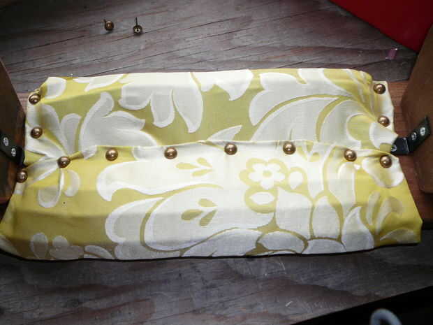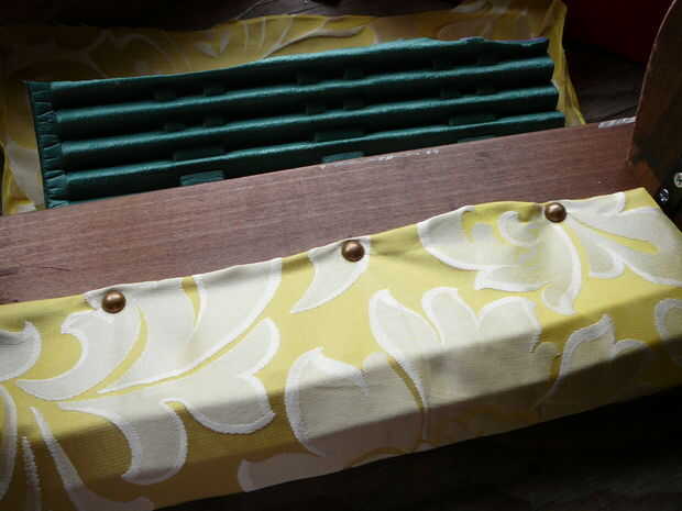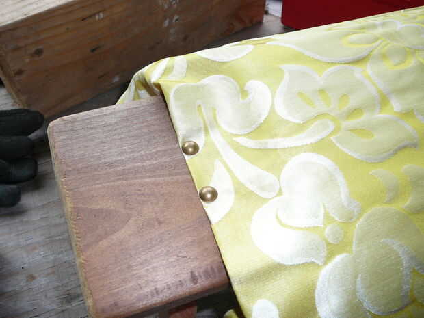 Desde aquí, la vuelta del Banco. Antes de añadir más tachuelas, uno de los extremos de la tela debe estar asegurado. Para ello, doblar los extremos de la tela en la parte inferior de la banca y tire firmemente. Seguro con tres clavos bien espaciados (este borde se cubrirán en un instante, por lo que es funcional solamente, no para mostrar).