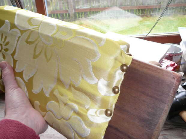 La tela puede ser complicado y un poco de coordinación. Recuerde que puede sacar las tachuelas y empezar de nuevo si es necesario. Esto puede tardar un par de intentos, pero bien vale la pena:)