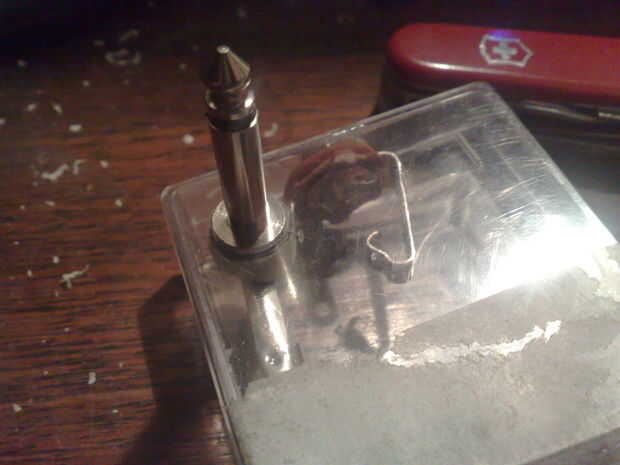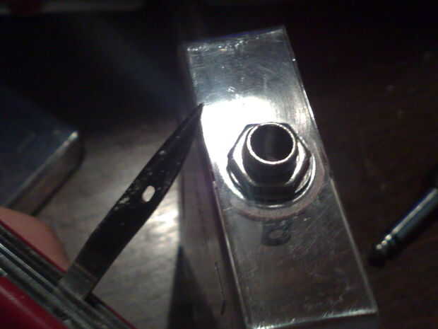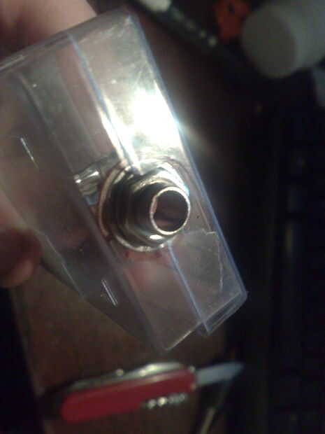 primero los agujeros en las cajas con la victorinox y coloque los componentes, primero pongo el enchufe en la caja, pero probablemente "duele" la guitarra así que cambiarlo por un cable y enchufe.