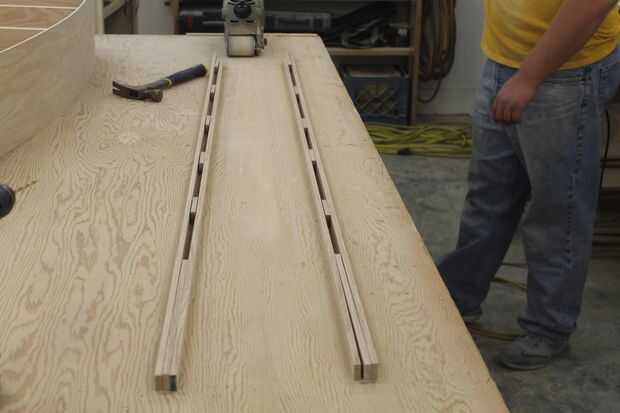 Este paso es costumbre todo lo que usted desee, esto es lo que hice. Comencé cortando al hilo tiras que fueron 3/8 "x 3/4". Hice los espaciadores y los colocó sobre cada estante y luego una tira larga en la parte superior, luego tomé mi otra pieza que corte y aproximadamente cortado a la medida, poniendo en la parte exterior de la embarcación y luego marcando la parte inferior. Hice que el interior del carril pedazo también. Si las piezas no encajan perfectamente que está muy bien, le ocultamos todos los extremos cuando elaboramos las piezas en el paso siguiente. Antes de poner las piezas del carril Asegúrese de que la arena les. Empezar por clavar y pegar tus separadores en, entonces clavo de pin y pegamento en lado y piezas laterales, asegúrese de usar un montón de pinzas. Que ese conjunto para arriba durante la noche. Una vez que está seca usted quitar pinzas y arena en la parte superior de la baranda con una lijadora de banda para hacer las piezas principales son incluso, volver y masilla todas grietas y agujeros para clavos. Después de que la masilla seque volver con una lijadora de acabado de lijar el exceso de masilla de y alisar todo. Pasan por los mismos pasos para completar el otro larguero lateral. Ahora estás listo para hacer tus piezas de adorno.