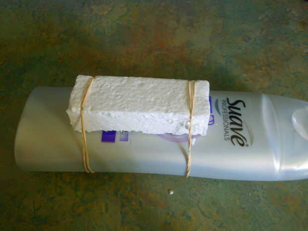 Usar las gomas para sujetar el rectángulo de espuma de poliestireno en la parte superior de uno de los lados ancho de la botella. Centro de la espuma de poliestireno como sea posible (globo ocular).