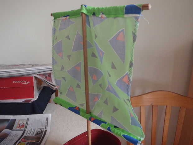 Comenzar por coser un bolsillo en la parte superior (la parte de 30cm), lo suficientemente grande como para adaptarse a la pieza larga de 30cm de espiga. (Tiene que poder deslizarse dentro y fuera) Que es básicamente un dobladillo grande. Lo mismo para la parte inferior. A lo largo de los lados haga una puntada de zig zag en la primera línea de la costura. Lo mismo para el otro lado. Deslice el pasador en los bolsillos. En la pieza superior de la espiga corte 3-4 puntos de sutura en el centro para dejar espacio a la otra pieza de 50cm de taco, el mástil. Deslice en. Donde la parte superior de los detalles de la espiga el paño baje una chincheta para mantenerlo en su lugar, luego de martillo lo... En el otro extremo, justo por encima de los otros puntos hacen otra ranura se deslice el otro extremo en.