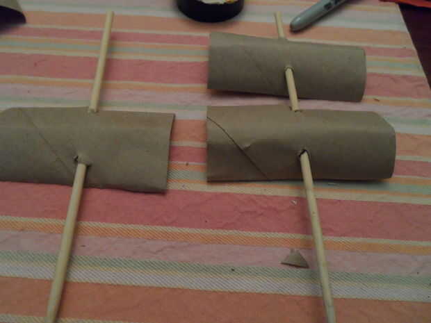 De encaje de palillos a través de los orificios de 2 piezas de tubo de cartón, para que el lado puntiagudo está lejos de ellos. Lo mismo para el otro palo de chop, excepto sólo poner una sola pieza de tubo de cartón en.