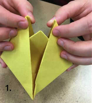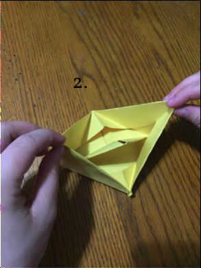 Convertir la plaza en forma de diamante y separe la parte superior de los triángulos para que parecen de 3 triángulos (2 en los lados 1 en el centro). Suavemente tire de los triángulos laterales alejados uno del otro y presionar en el pliegue de la parte inferior para que el barco es más fuerte.!