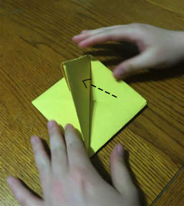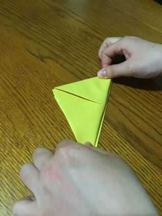 Colocar el papel para que la abertura quede frente a usted. Doblar una aleta hacia arriba para coincidir con la esquina superior, voltee el papel y repita con el otro lado. Debe tener una figura de triángulo.