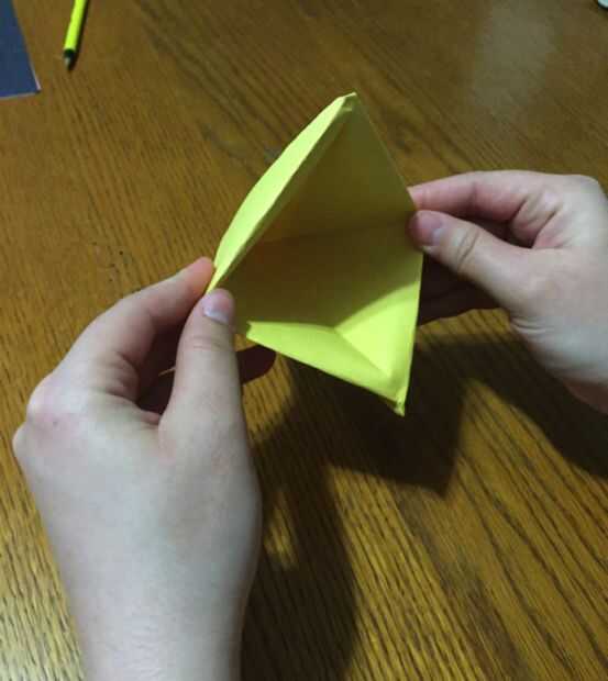 (Paso 6) Recoger el papel y girar 45 grados, utilice los pulgares para abrir los pliegues para crear un diamante como figura. Una vez en la forma del diamante squish para hacer un cuadrado. (Puede necesitar a nuevo 45 grados para ver la figura cuadrada) Presione hacia abajo a lo largo de los pliegues para mantener la forma cuadrada.