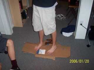 Doble una ned del lado abierto hacia arriba, luego el otro, como en mi sombrero de papel instructable. El chico es pararse en él para mantenerlo hacia abajo.