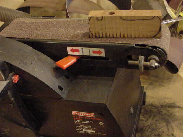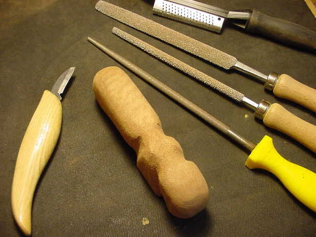 Puede usar la correa y la lijadora de disco para quitar el exceso de la madera para comenzar a formar el mango y usar herramientas de mano para obtener más que de forma sutil. Error en el lado de eliminar al menos más que hará su conformación final, una vez que la caña está montada.