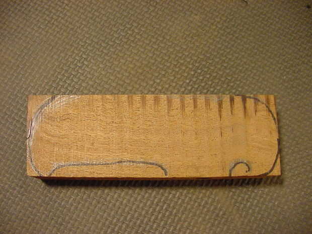 El tamaño de la madera necesaria para la manija es 6" L x 2" W x 1.5" de espesor. Primero asegúrese de que los lados superior e inferior son cuadrados para que cuando taladre el agujero para conectar al eje, la espiga encajará ángulo recto, de lo contrario se ángulo y sus conexiones de carpintería estará apagado. Dibuja tu diseño en la gran superficie de la madera. Marca donde el mango une con el eje. Marcar la zona donde el agujero debe ser perforado con la "X" como se muestra para el eje. Taladre el agujero de 1.5" de profundidad con la pieza Forstner, igual que hace con el eje de 5/8".